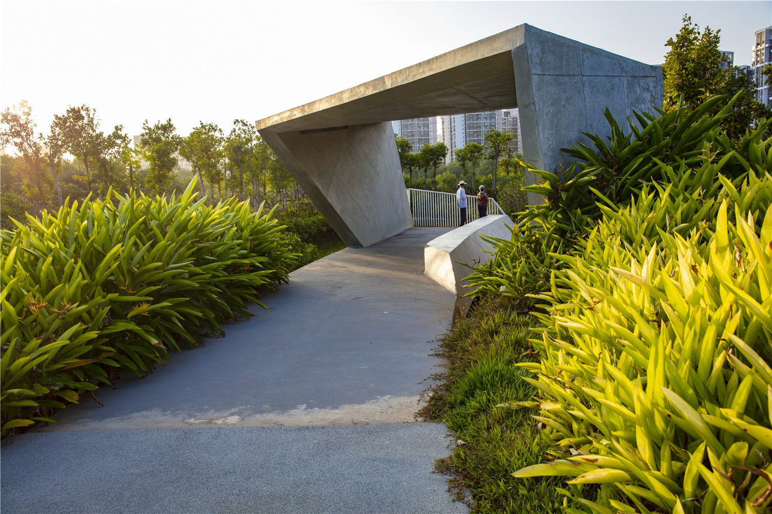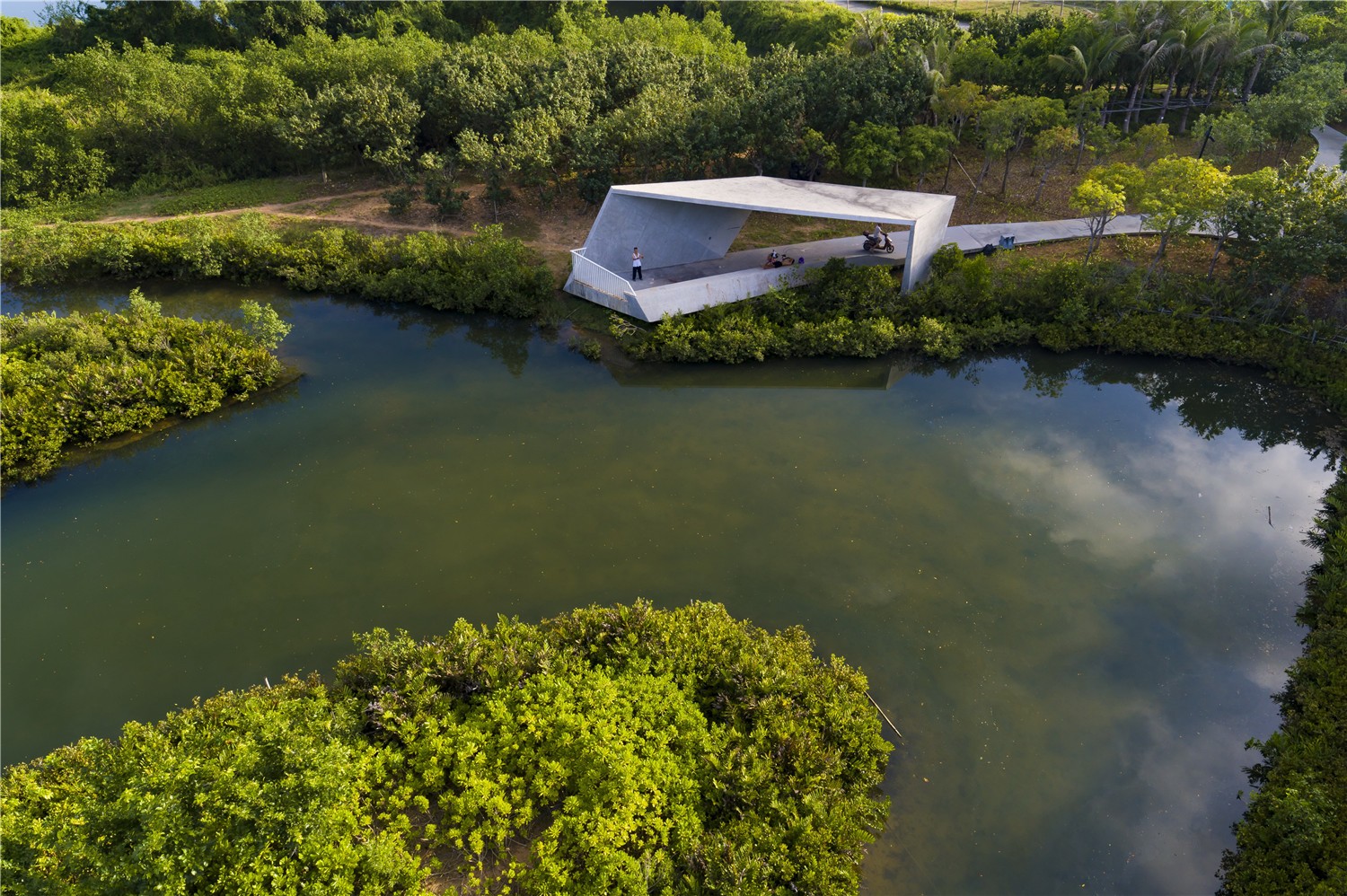 Landscape boxes and slow lanes adapted to terrain: The design of footpath network follows the change of terrain, and the aerial walkway floating above the natural scenery brings people into the forest to overlook the mangrove forest. Five landscape boxes are carefully arranged in the quiet and beautiful position of the forest, and at the same time become the necessary shade and rain shelter space in the changeable climate. Modular concrete boxes can withstand strong tropical storms, and different angles of placement create the best view for Birdwatching enthusiasts.