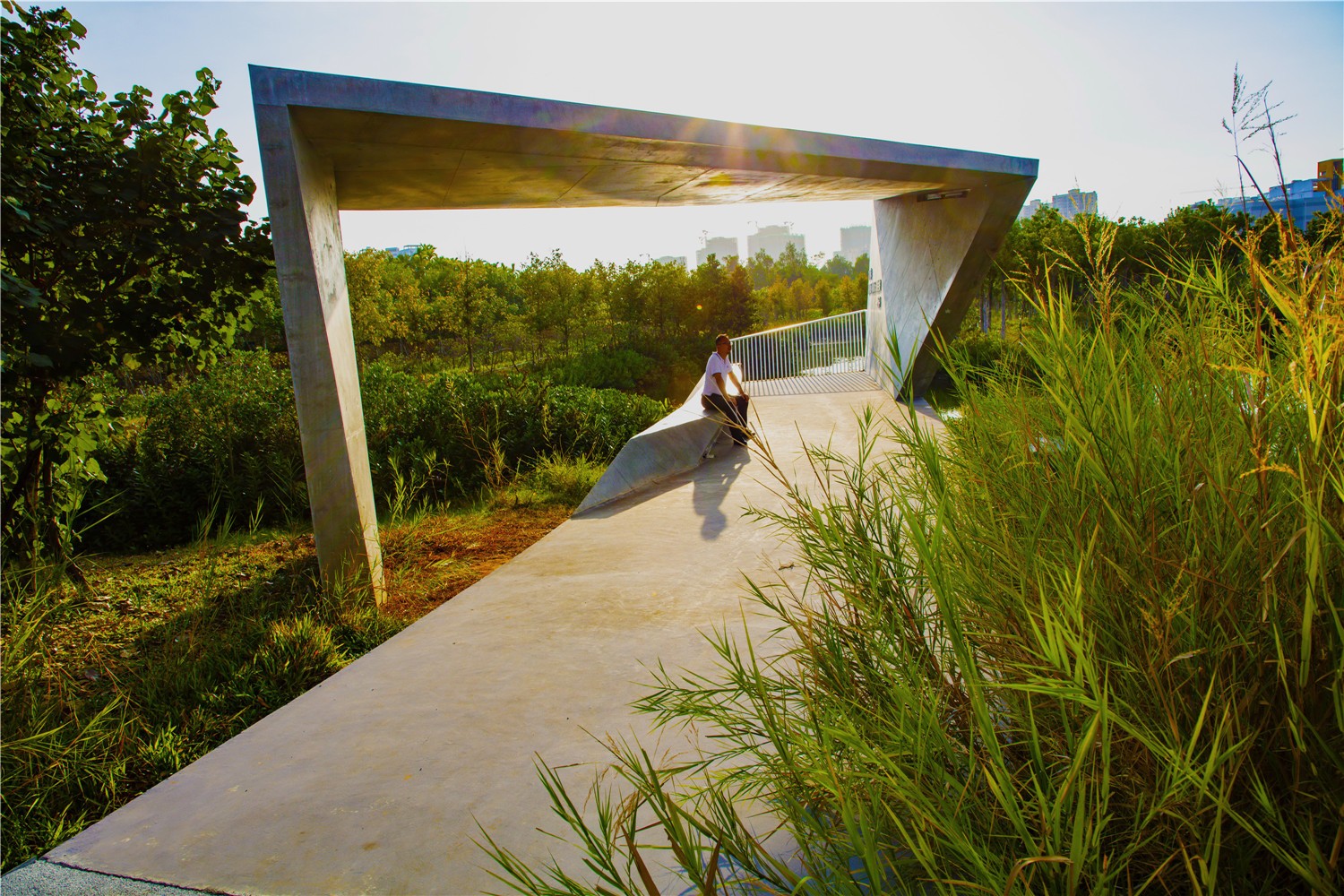 Platform and ecological corridor: A series of platforms and ecological corridor systems are established by utilizing the 9-meter height difference between road and water surface to intercept and purify the surface runoff from the city and to arrange the high and low public spaces.