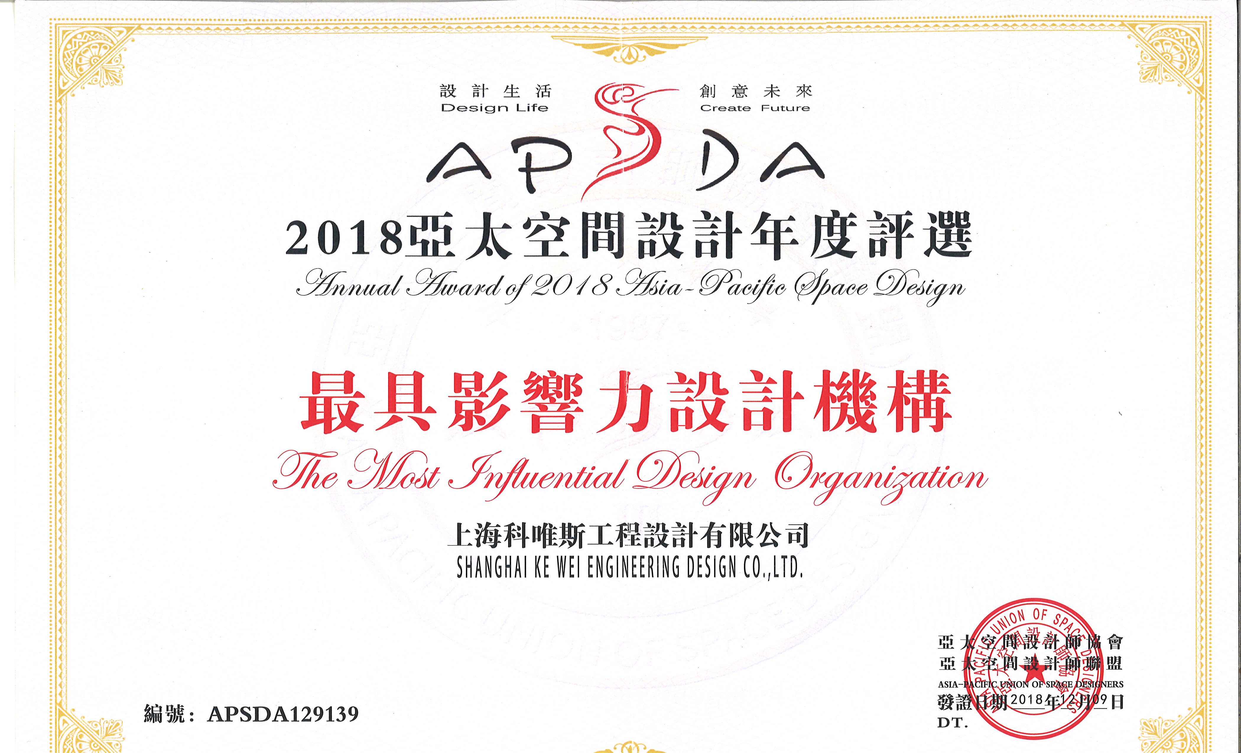 上??莆ㄋ构こ淘O計有限公司榮獲2018亞太空間設計年度評選最具影響力設計機構(gòu)