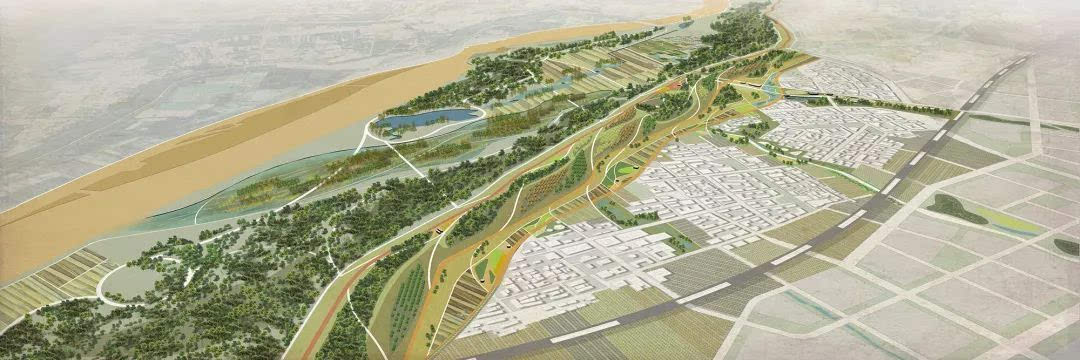 項(xiàng)目從三個(gè)不同尺度研究了黃河大堤與堤壩間生態(tài)帶。分別是 183 km 的市域尺度,30 km 城區(qū)尺度和 4 km 公園尺度。市域尺度側(cè)重于黃河的生態(tài)恢復(fù)的討論。城區(qū)尺度提供了一系列設(shè)計(jì)策略,將黃河走廊打造為公共開放空間,加強(qiáng)黃河與城市的聯(lián)系。 這些設(shè)計(jì)策略在之后選定的啟動(dòng)區(qū)公園中得到具體反映,這是該研究的第三個(gè)尺度。