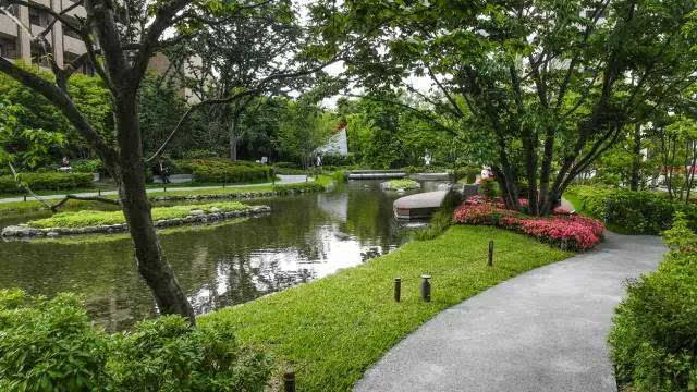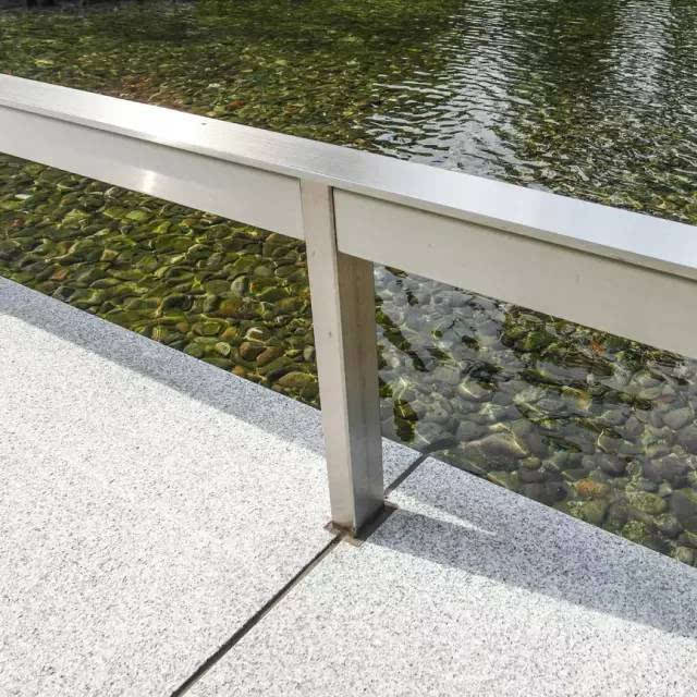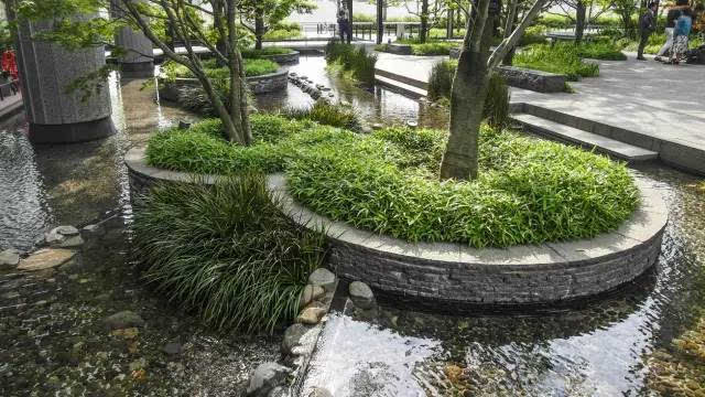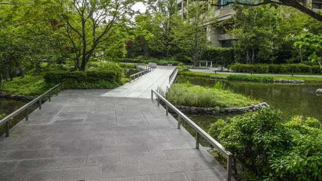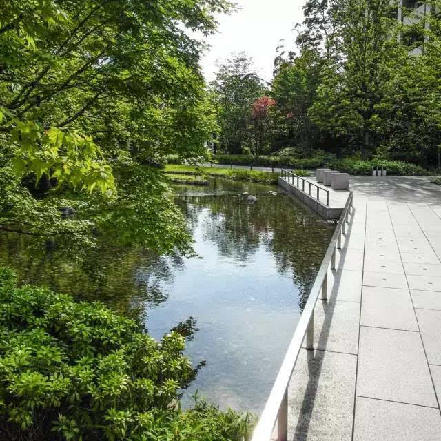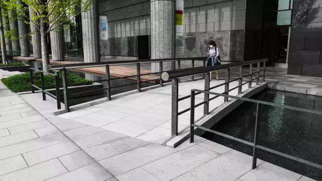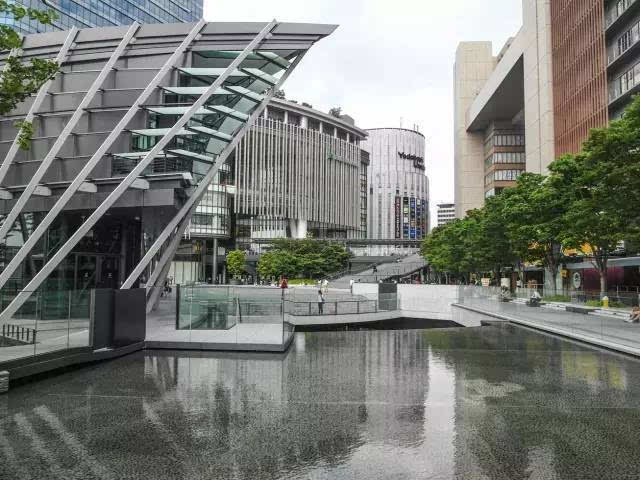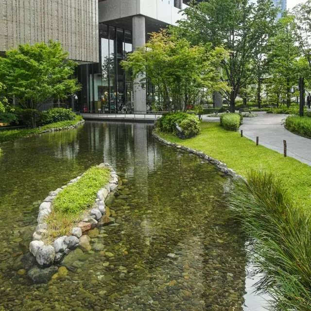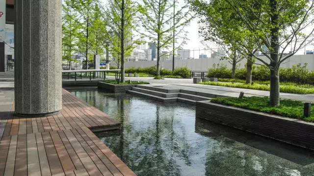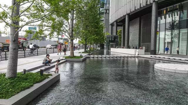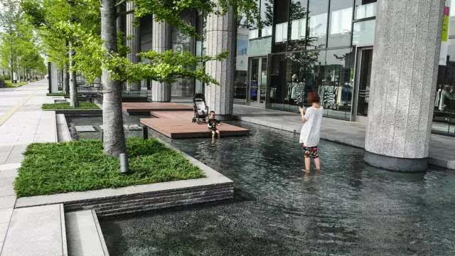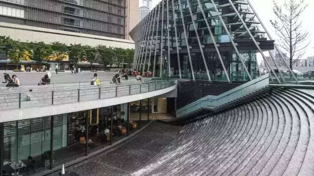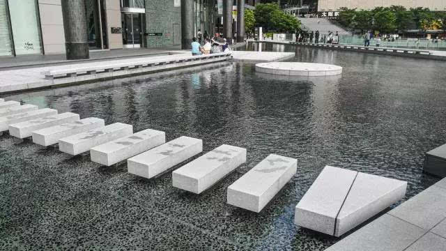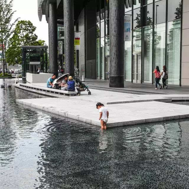 安藤忠雄的作品向來取借自日本傳統(tǒng)美學(xué),廣場中以兩大水池為主景,穿道中間則設(shè)置低長石椅,幾分茶室長椅風(fēng)格,其中一池中間則以一個個方型灰石橫跨水間,像是京都鴨川河面上的跳跳石,池水不僅作為景觀之途,更以戲水功能增添親水性,夏天來訪,不少家長任由小朋友們脫了鞋就下水玩,可是一點也不在意弄濕的衣服。