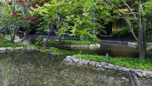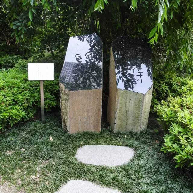 光面的置石倒影著枝葉