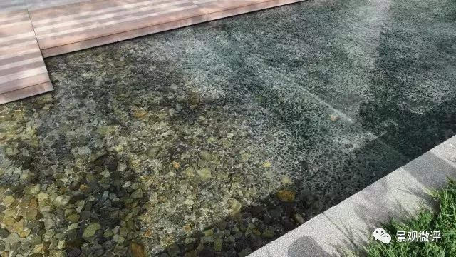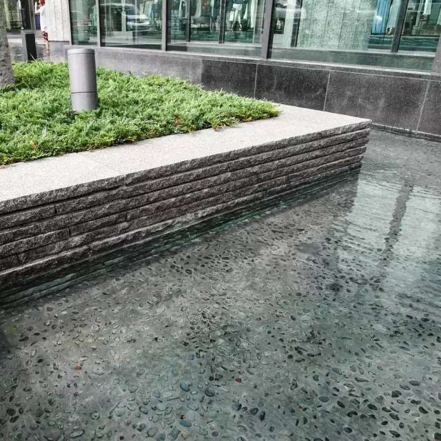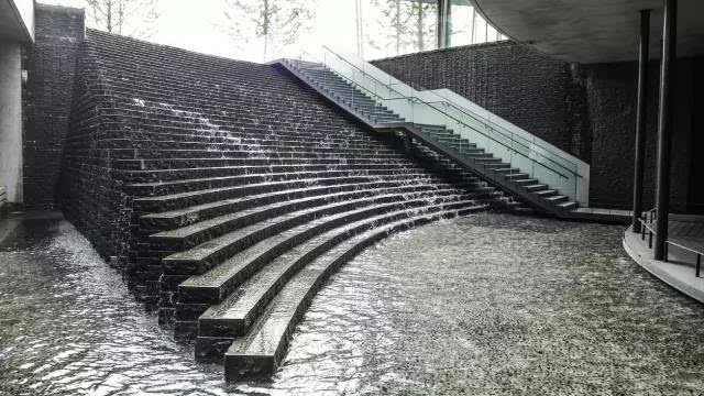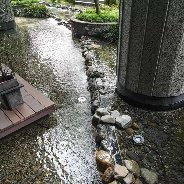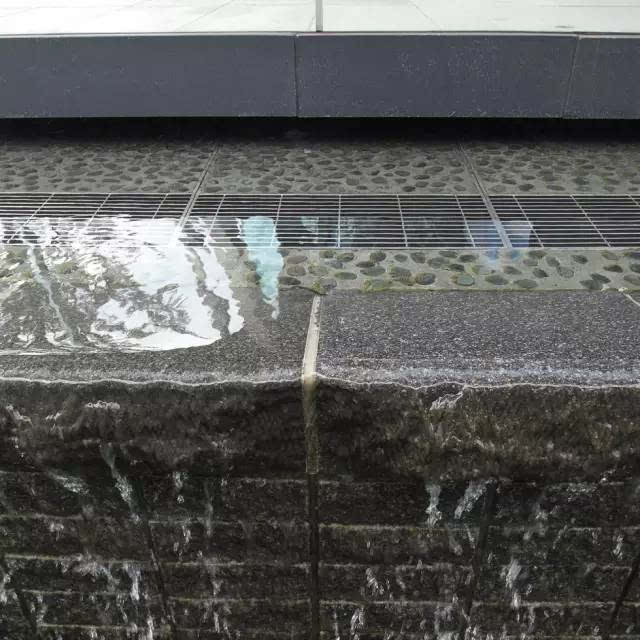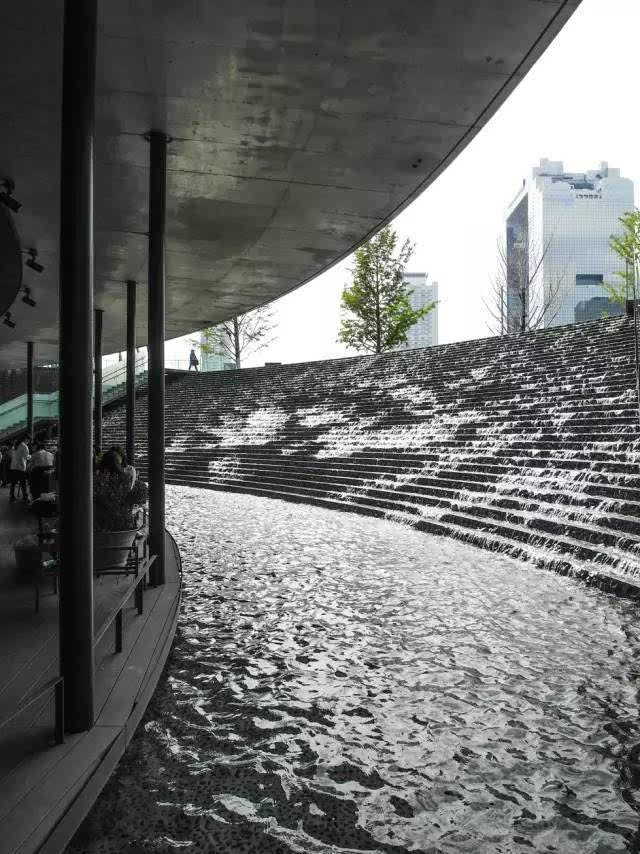 大疊水直接跌落到地鐵站的下層空間,因為下層喇叭口式的造型,無形中變成一個擴音器,把跌水的氣勢渲染的更加濃烈,猶如瀑布傾斜般壯觀!因為高差很大,底端水花的飛濺影響行人通行,所以這個區(qū)域玻璃扶手的高度、通透感、圓滑度都是經(jīng)過巧妙處理的。