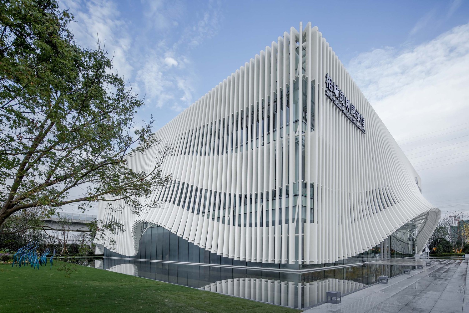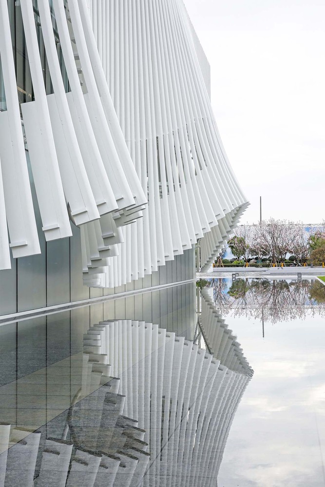 在項目景觀打造上,我們強調水景的應用,為保證倒影的完整,將通往建筑主入口的道路設置在側面,建筑飄逸的曲線外衣倒印在水中,顯得那么的迷人,外表皮的形象構思來源于一種樂器,叫馬林巴琴,建筑是凝固的音樂,我們希望這個小建筑能在水天的映襯下奏出美妙的樂章。