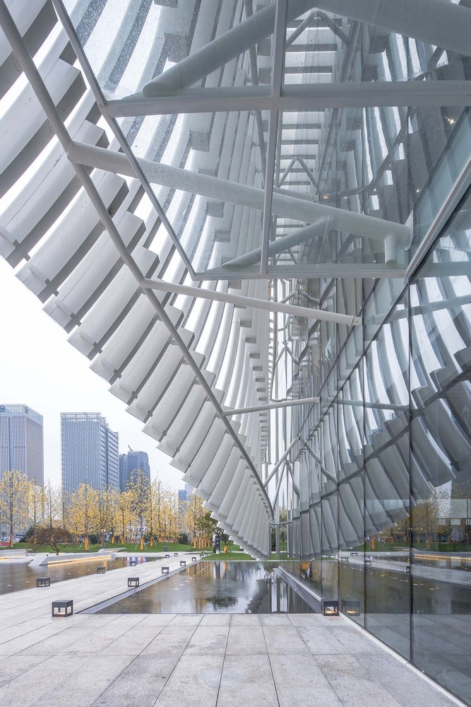 建筑的高度尤為重要,我們把建筑高度定在與高鐵上的人視線齊平。高度確定,經(jīng)比例推敲,結合柱跨和各方因素最終決定,長寬定為46米。外表皮肌理采用鋁方通桿件,外表皮大小與間距組成的標準片段與建筑柱網(wǎng)嚴格對應。每根桿件分為五等分,內側做暗紋處理,同時桿件端部做卷起處理,使建筑更增柔美靈動。