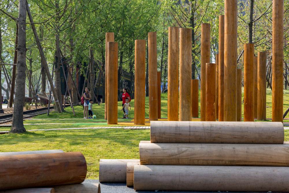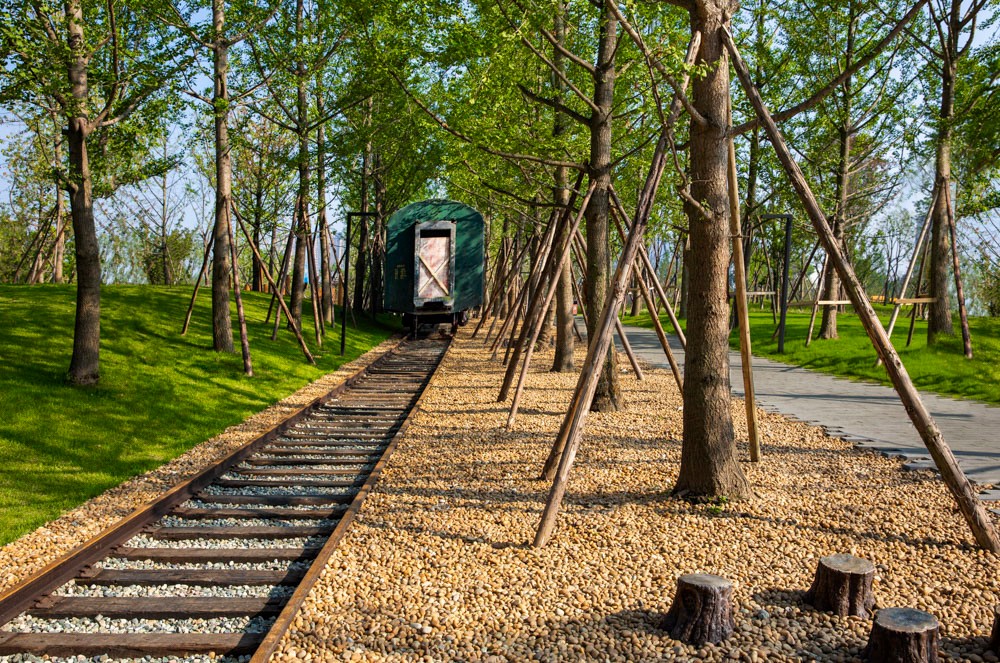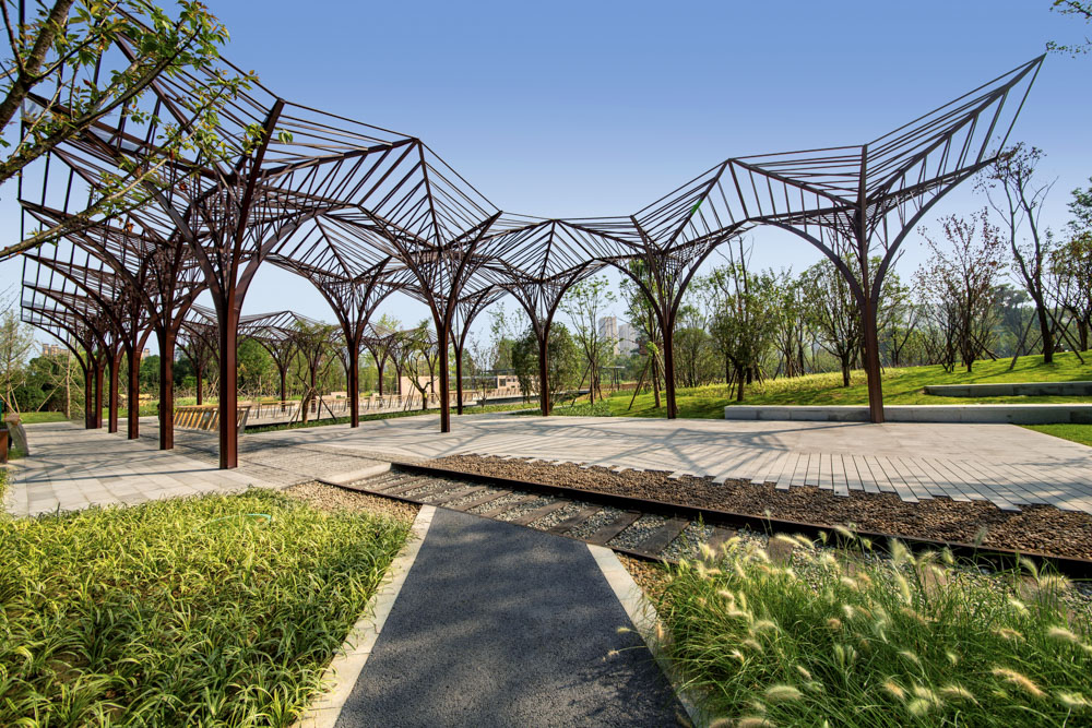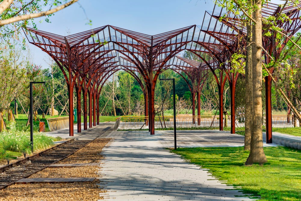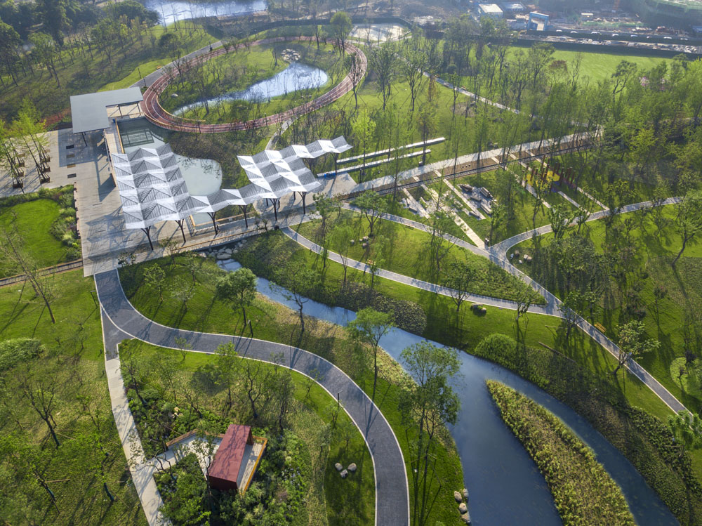 沙河源公園,位于大西南建材城舊址,大量遺留的鐵軌及存儲木材的廠房被作為設計要素加以提煉。同時場地由府河、沙河環(huán)抱形成雙河環(huán)抱、四面環(huán)水的河心島形態(tài),水質(zhì)優(yōu)良,植被茂密。這里也位于錦江綠道規(guī)劃帶中,沙河源公園的建立,形成了全新的、連續(xù)的城市綠廊。