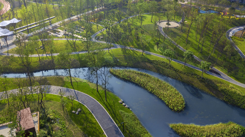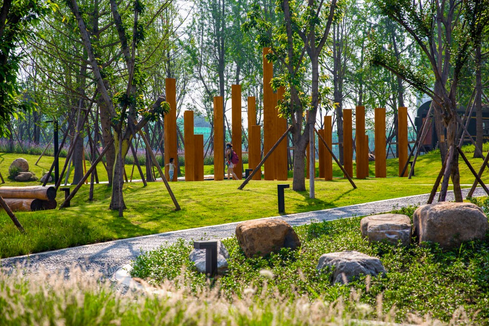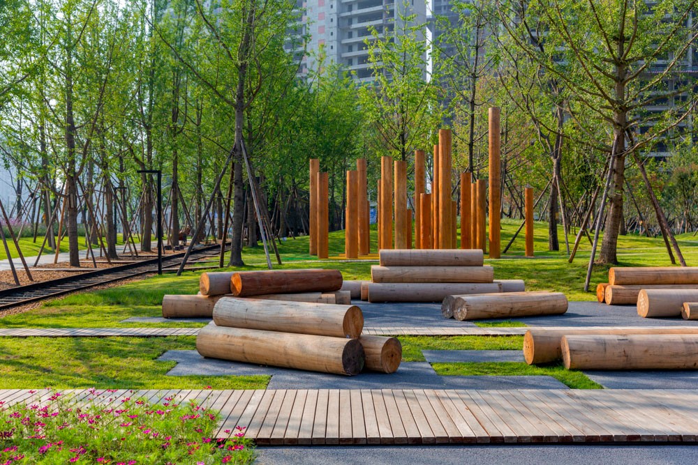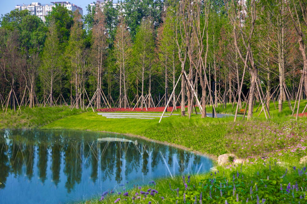 以木材文化為設計主題,尊重生態(tài)、感懷歷史,提煉出極具特色的水木華年、木排水憶、花林漫徑、云汀渡橋、水杉長堤等生活藝術場景,展現(xiàn)公園四季有景可賞的自然游玩性,再現(xiàn)場地的文化記憶,助力成都碧水長流、生機盎然的宜居濱水長廊新風貌。